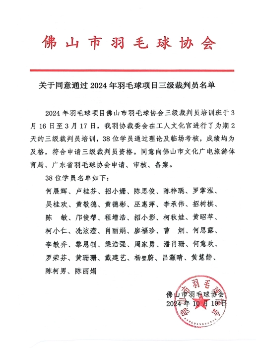 关于同意通过2024年羽毛球项目三级裁判员名单