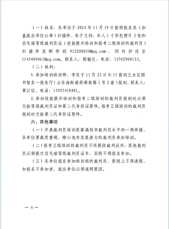 为办好佛山市第十一届运动会羽毛球比赛,发展和壮大我市羽毛球裁判队伍,提高裁判员业务水平和综合素质,掌握和了解羽毛球球项目发展趋势,学习最新《羽毛球竞赛规则》(2023版)。经研究,定于2024年11月23-24日举办2024年佛山市羽毛球裁判员技能提升培训班暨晋升二、三级羽毛球裁判员培训班。